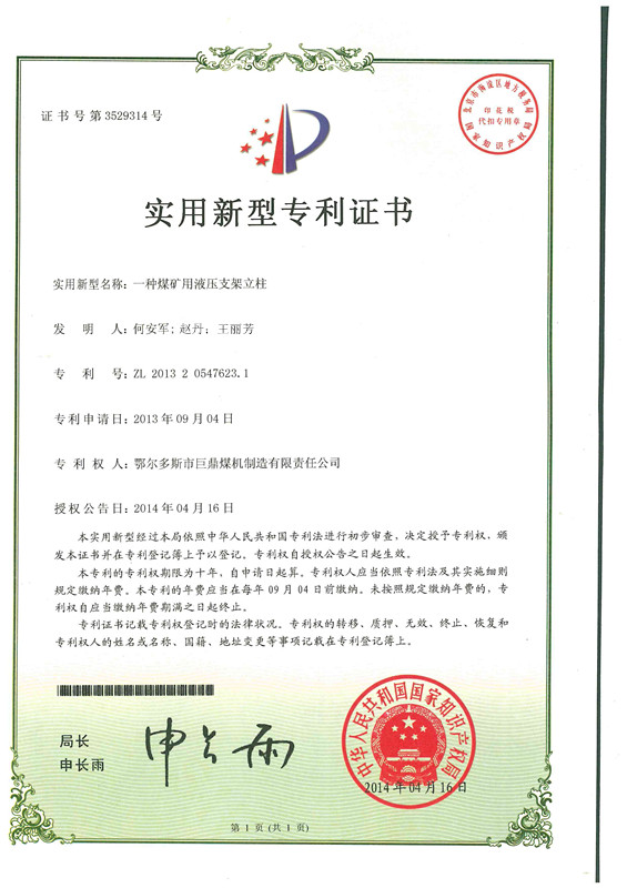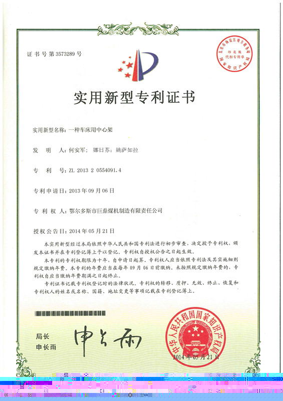 煤機公司申請的《一種車床用中心架》《一種煤礦用液壓支架立柱》兩項專利已經通過國家知識產權局的審批,并取得國家實用新型專利證書。公司一直注重技術創新,在吸取國內外先進經驗的基礎上,堅持不懈地鉆研先進的技術和工藝,結合我國相關行業的現實情況研發了具有實用性、新穎性、創造性的車床用中心架和煤礦用液壓支架立柱。
