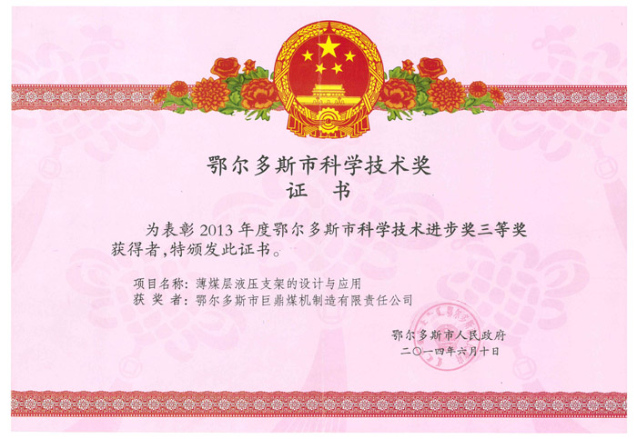 巨鼎煤機公司自成立以來始終瞄準先進技術,不斷進取創新,取得了豐碩成果。2014年6月,巨鼎煤機公司的“薄煤層液壓支架的設計與應用”項目順利通過了鄂爾多斯市科學技術局對其《技術總結報告》《工作總結報告》《經濟效益分析報告》等資料的技術審查及鑒定,獲得2013年度鄂爾多斯市科學技術進步獎三等獎。