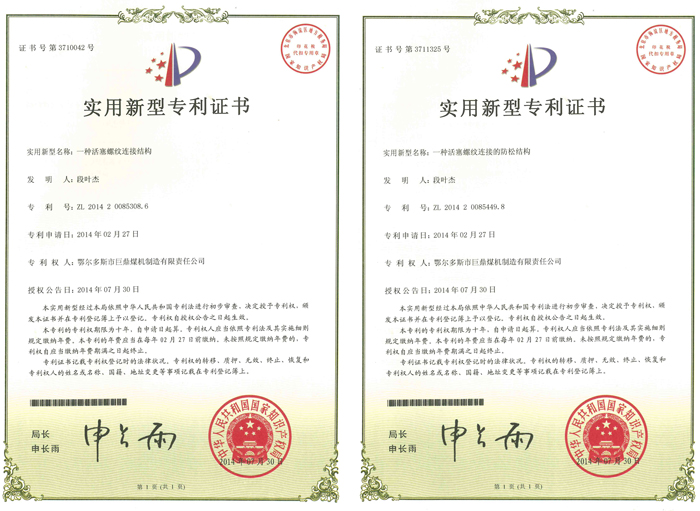 近日,煤機公司申請的四項專利《一種液壓支架底座》《一種裝缸機》《一種活塞螺紋連接結(jié)構(gòu)》《一種活塞螺紋連接的防松結(jié)構(gòu)》已經(jīng)通過國家知識產(chǎn)權(quán)局的審批并取得國家實用新型專利證書,這四項專利的技術(shù)水平均超過了同行業(yè)的平均水準。四項專利權(quán)的獲得,進一步提升了巨鼎在液壓支架領(lǐng)域的技術(shù)水平,有利于充分發(fā)揮產(chǎn)品的知識產(chǎn)權(quán)優(yōu)勢,對于提高品牌知名度、拓展產(chǎn)品市場具有重要意義。